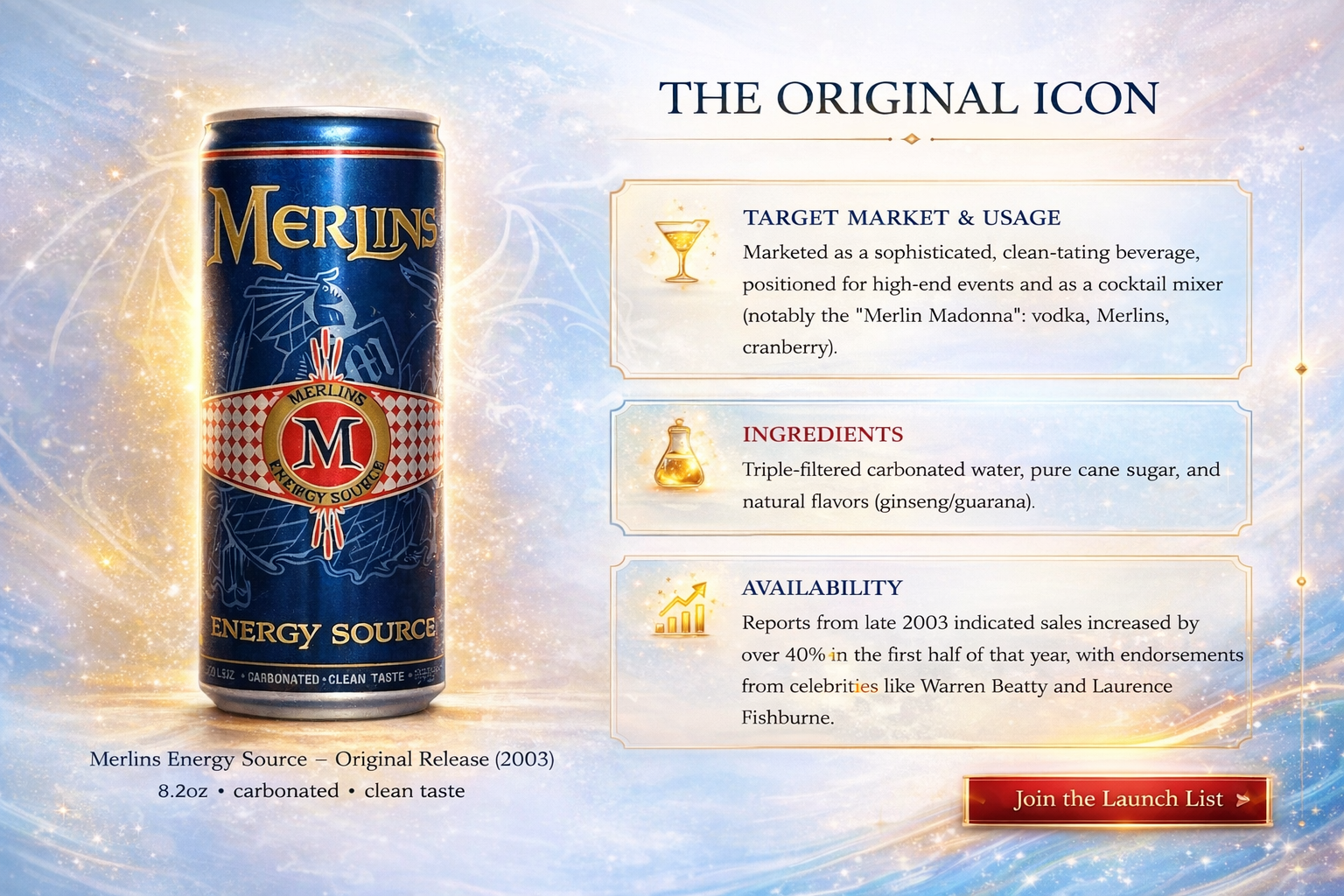 Brand History: Originally promoted as a premium energy drink in exclusive venues and backstage environments, Merlins Energy Source experienced rapid growth, including a reported 40% sales increase in its early years.